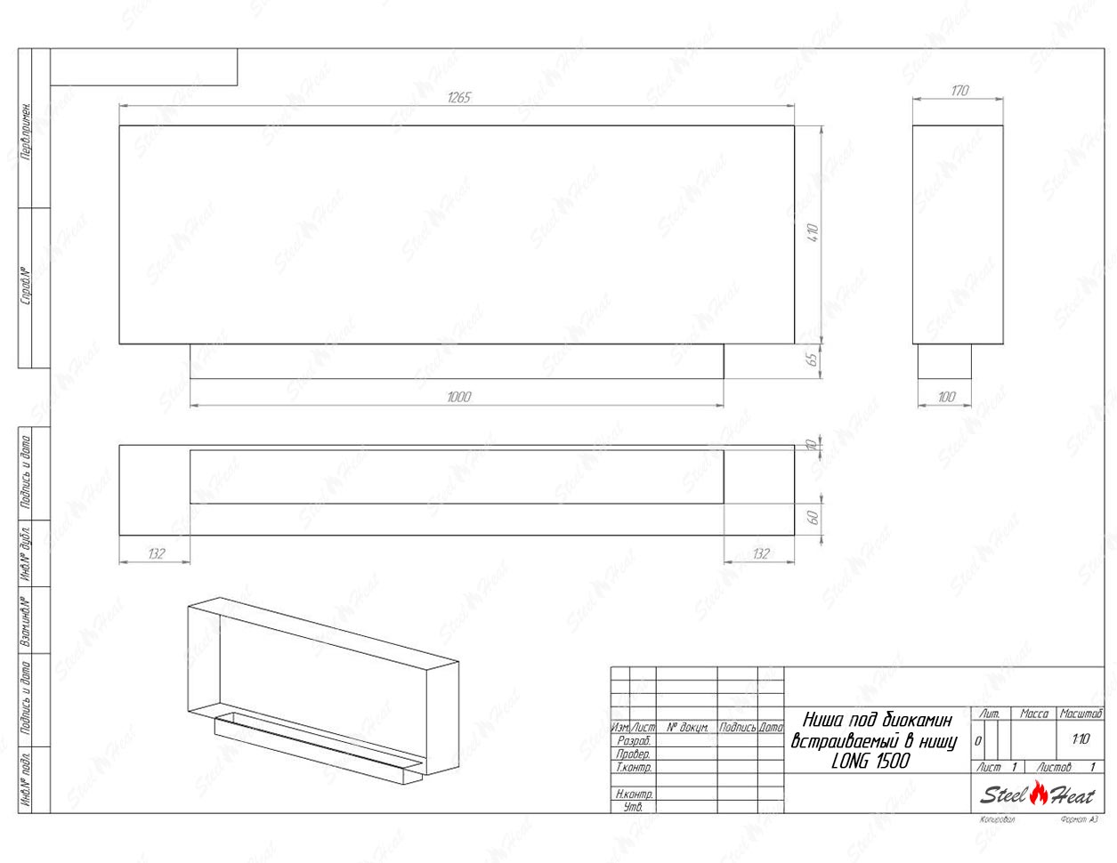Встраиваемый Биокамин SteelHeat LONG-V 1500 предназначен для встраивания в глухие ниши из гипсокартона, кирпича, пеноблоков, бетона.