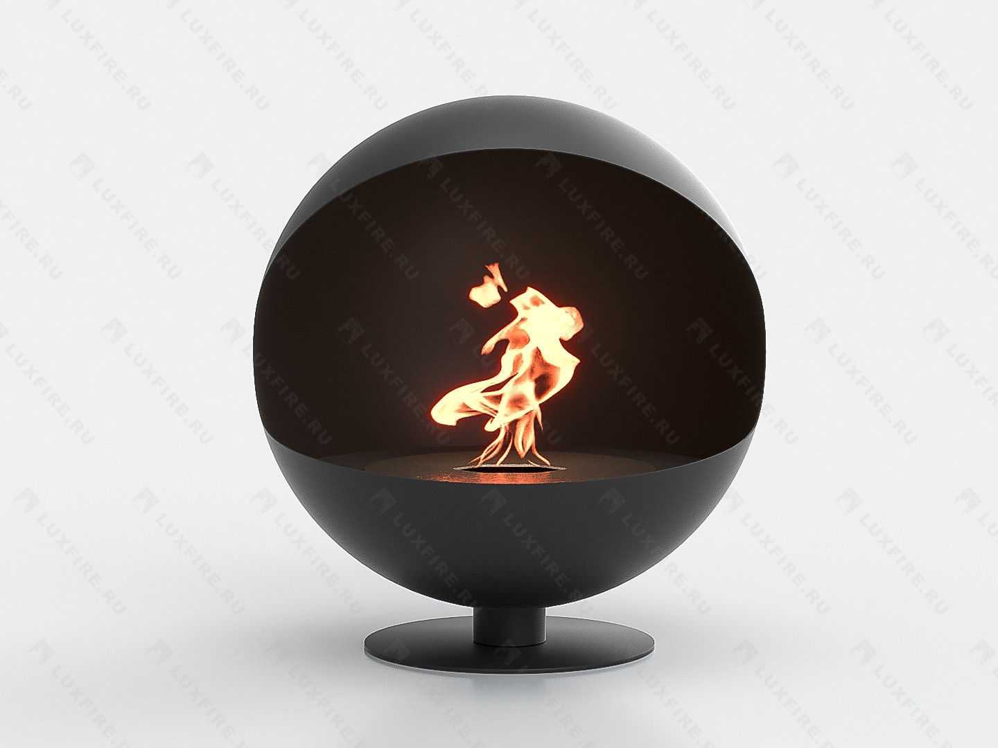 Представляет собой металлическую сферу на низкой подставке. Состоит из опоры, поворотного корпуса и топливного блока Lux Fire 150-1. Опора и корпус биокамина изготовлены из стали и покрыты порошковой эмалью. Корпус имеет узел вращения и может поворачиваться на 360°.